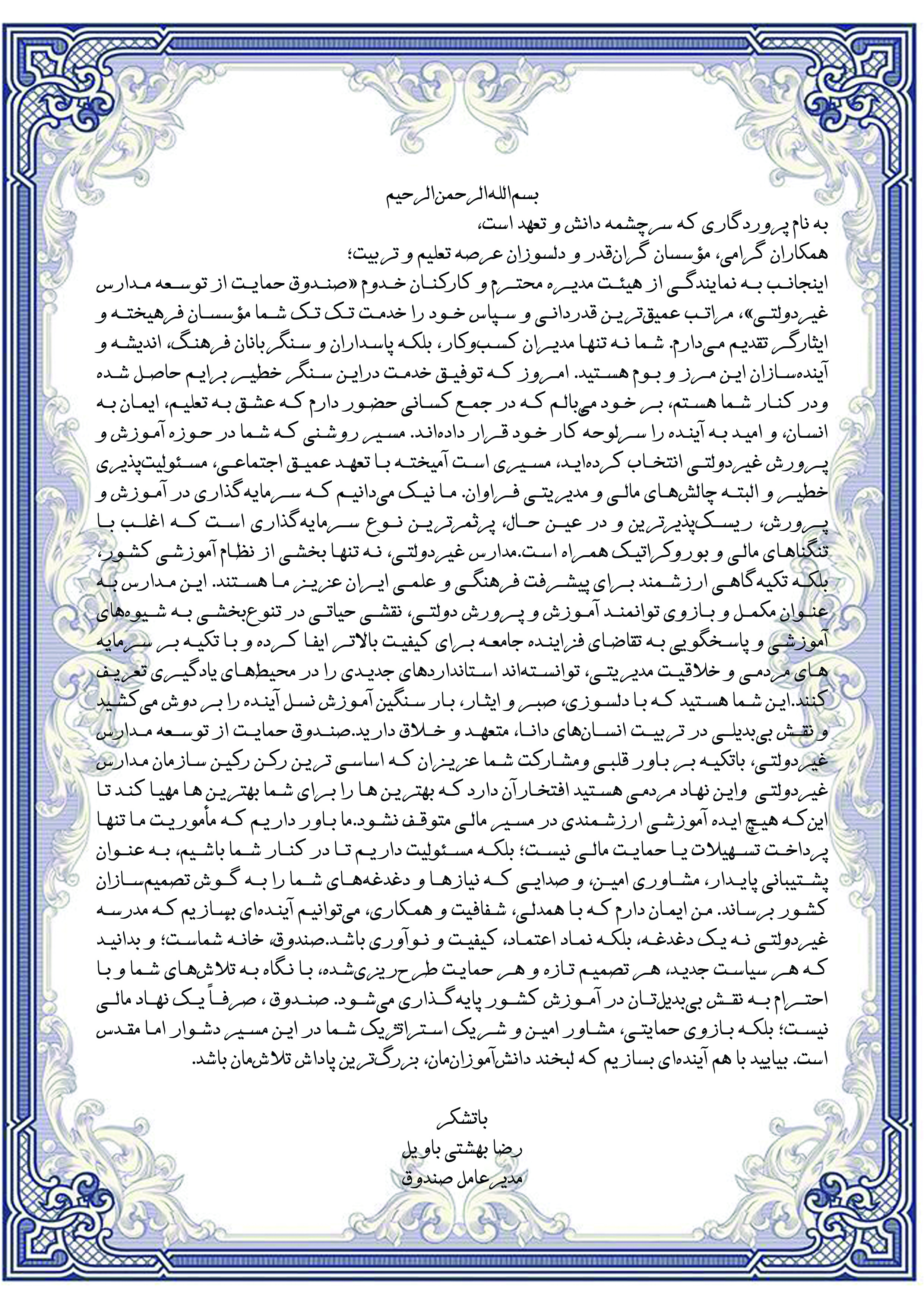 پیام تبریک مدیر عامل صندوق حمایت از توسعه مدارس غی...